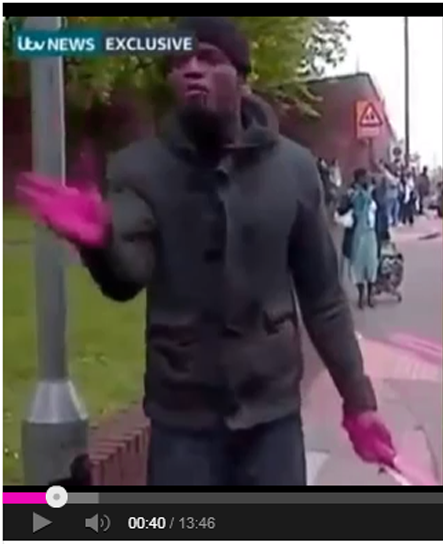 Found the entire rant here, curious how most of it is edited in other clips... Also this is a third camera, with a red double-decker bus, proper sign and line colour, and his hands still don't look all that blood-stained to me.